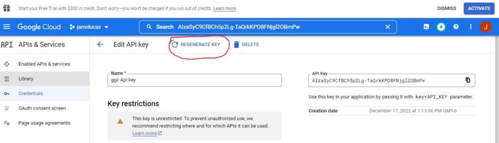 1. Make sure you have created an API key and associated it with your project.Select your project > Click on the hamburger menu and selecting APIs & Services > Credentials.