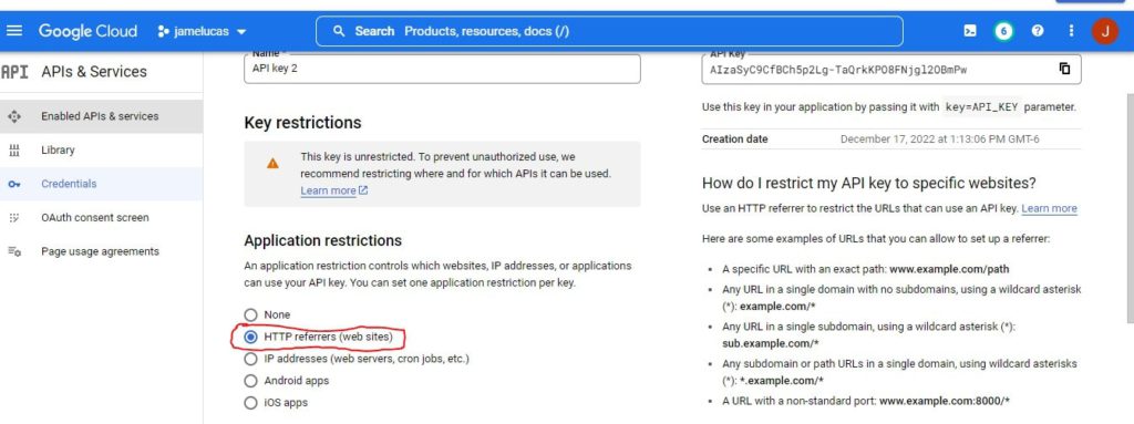 Click the Edit button for the API key on the Credentials page and then set the Application restrictions to HTTP referrers. Add the Referrers, which are the domains that you will allow to use the API key.