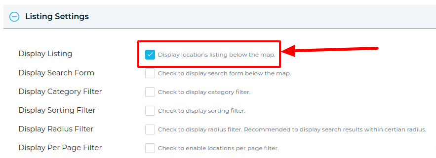 Step 1 Go to Add or Edit Map and scroll down to the Listing Settings section.