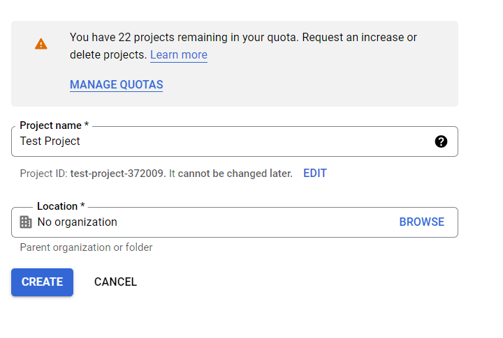 Choose your country name and click on I agree on terms and conditions. Give a project name and if you are having an organization, then choose location or browse otherwise you can leave that. Then click on the create button.