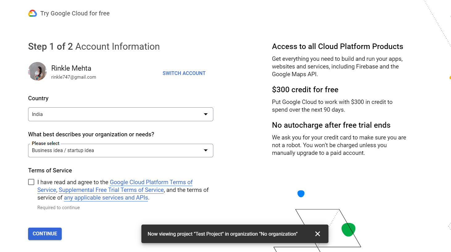 Here you will see that Google will give you $300 as a credit that you can use for the next 90 days. Choose country, and choose what are the things that describe your organization and click on the check box and then continue.