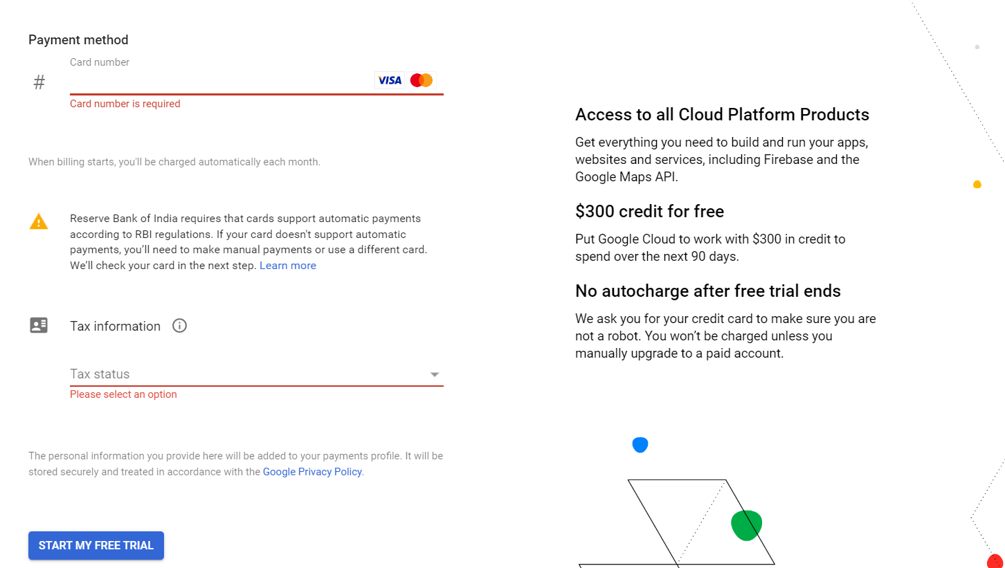 You have to enter all the billing information. Google will give you $300 credit. So, if you are having a smaller project then you do not need to pay anything for Google Map. Click on create project.