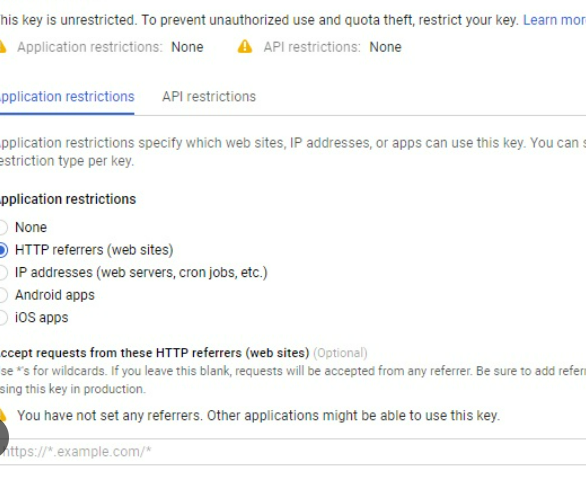 If you are using for the websites, then choose HTTP referrers and add a website details in the box. Click on the save button to continue.